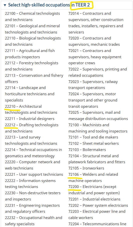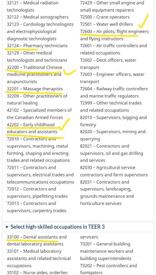 (2) 이민국에서 지정한 NOC TEER 2 또는 3 직업군: 이민국에서 허용한 직업군 상세리스트는 아래와 같습니다. NOC TEER 2와 3에 해당하는 직업군은 매우 다양하며, 여러 산업 분야를 포함하기는 합니다. 아래 모든 직업군이 나와있기는 하지만, 다 볼 필요까지는 없고 아무래도 외국인으로서 한국인으로서 취업하기 용이한 직업들만 제가 하이라이트해뒀습니다.(아래 첨부된 이미지를 참고하세요!)