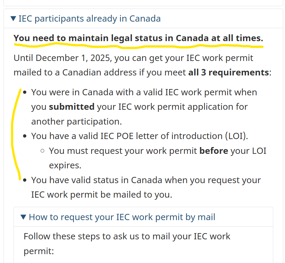 (1) 두 번째 워홀을 신청할 때 첫 번째 IEC 퍼밋이 유효했었는지 (2) 승인된 LOI (레터 오브 인트로덕션)를 가지고 있는지 (3) 웹폽 신청하는 순간에도 캐나다에서 합법적인 체류 상태인지