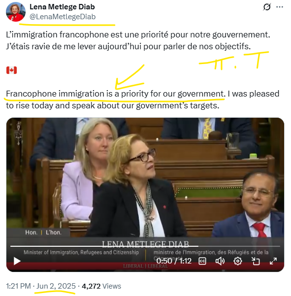 2025년 6월의 첫 주, 캐나다 이민을 준비하던 많은 이들의 마음에 불안이 스쳐 갔다. 바로 새로 부임한 이민부 장관, 레나 메틀리지 디아브(Lena Metlege Diab)의 공식 발언 때문이다. "Francophone immigration is a priority for our government." — 이 한 문장이 SNS와 이민 커뮤니티를 타고 번졌다. 아래는 레나 장관의 트윗에서 퍼온 이미지로 하원 본회의장에서의 발언 영상 중 스크린샷을 딴거다.