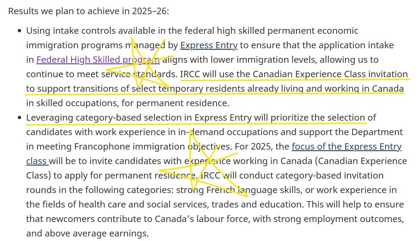 진짜 핵심은 여기에요: “우리가 외부에서 유입을 막았으니, **지금 캐나다 안에 있는 너희들을 영주권자로 전환시켜줄게.” 이게 바로 트랜지션 플랜입니다. 더 구체적으로 들어가면, FSW (Federal Skilled Worker) 같은 해외 인재보다는 CEC (Canadian Experience Class), 즉 캐나다 내 경력자에게 초점을 맞추겠다는 걸 다시 한번 못 박고 있는거죠. 그러면서 동시에 Express Entry의 카테고리 기반 추첨을 강화하겠다고도 했습니다.