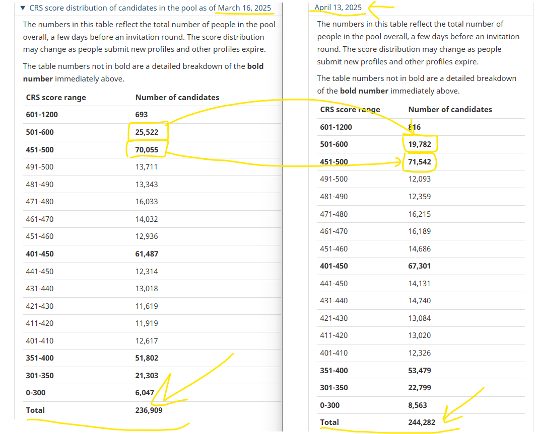 다만 실제로 그 점수를 갖고 있었던 지원자 비중이 생각보다 크지 않았고, 그중 대부분이 인도 출신이었다는 사실에 비추어 점수가 사라진다고 해서 전체 CRS 점수대가 갑자기 무너질 거라는 기대는 조금 과한 낙관일 수도 있다는 이야기였지.