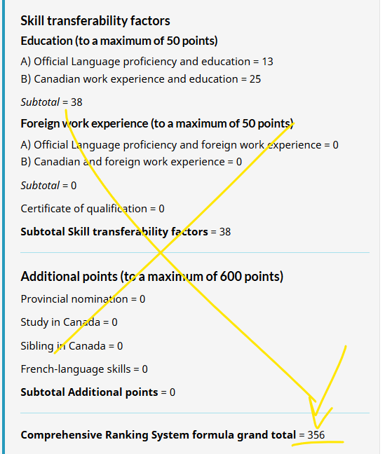 한국에서 1년 이상 NOC 0, A, B (지금은 Teer 3이상으로) 에 해당하는 경력을 쌓는다면 CRS 점수는 유의미하게 오른다. 캐나다 경력 + 외국 경력의 조합은 또 다른 가산점으로 이어지고, 그 1년은 영어 점수를 끌어올릴 수 있는 시간까지 준다. CLB 7에서 CLB 8로만 올려도 60점 가까이 점수가 튀어 오른다. 356점이 418점이 되는 거다.