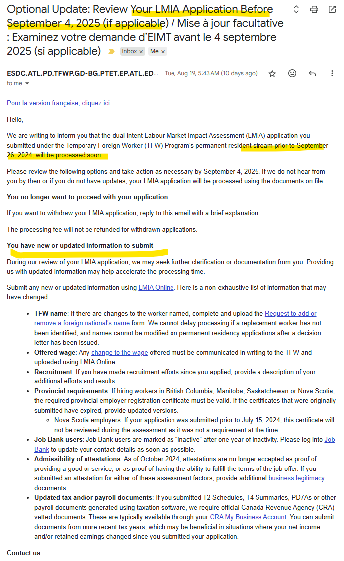 서비스 캐나다가 최근 발송한 전체 이메일을 보자면 2024년 9월 26일 이전에 접수된 PR LMIA 신청자들에게 보낸 일괄 안내다. 요지는 단순하다. “9월 26일 전에 보낸 PR LMIA 케이스를 곧 처리할 예정이니, 작년에 보냈던 정보에 대해 새로운 업데이트가 있으면 제출하고, 없으면 기존 서류대로 심사하겠다”는 것이다. 그간 접수 후 12개월 이상 아무 소식이 없었던 신청자들에게는 실제 심사가 재개되고 있다는 신호니깐 의미가 엄청 크다.